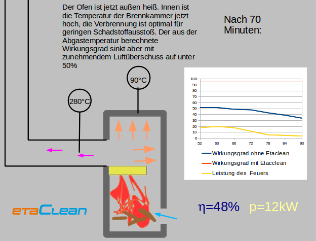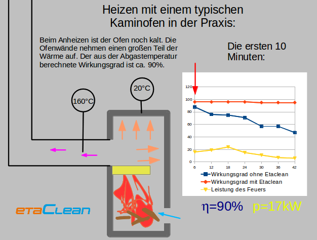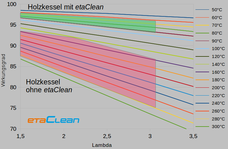 Eine hohe Energieeffizienz bei Heizungen ist nur durch eine möglichst niedrige Abgastemperatur erreichbar - so geht nur ein geringer Anteil der Energie ungenutzt verloren. Durch den Einsatz von Brennwerttechnik ist hier bei Gaskesseln und inzwischen auch bei Ölkesseln ein hoher Standard erreicht. Bei Holzheizungen sieht es anders aus: hier ist bisher nur bei wenigen Pelletkesseln Brennwerttechnik und die damit hohe Effizienz möglich. Bei anderen Holzkesseln und Öfen besteht das Problem, dass die Oberfläche eines für diese Technik nötigen Hochleistungswärmetauschers zu schnell von Ablagerungen belegt wird. Damit ist nicht nur ein Leistungsverlust verbunden, sondern auch die Gefahr eines Verstopfens und in der Folge unkontrollierte Verbrennungsbedingungen und Gefahren. Mit den etaClean-System sind diese Probleme lösbar.