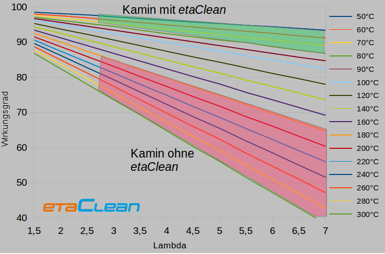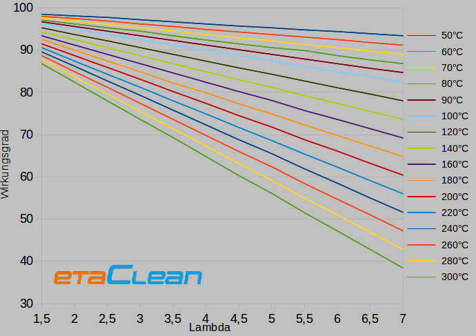 Die Effizienz einer Holzheizung ist von der Abgastemperatur abhängig. Es ist offensichtlich, dass bei höherer Abgastemperatur mehr Wärme ungenutzt verloren geht. Ein weiterer wichtiger Faktor ist der Luftüberschuss, dieser wird auch als Luftüberschussfaktor Lambda bezeichnet. Der Luftüberschuss ist der Anteil von Luft, der zwar durch den Ofen strömt, aber nicht an der chemischen Verbrennungsreaktion teilnimmt. Diese Luft muss aber trotzdem mit erwärmt werden und enthält dann einen Teil der bei der Verbrennung freigesetzten Energie. Bei gleicher Abgastemperatur geht daher um so mehr Energie ungenutzt verloren, je höher der Luftüberschuss Lambda ist. Trotzdem ist der Luftüberschuss nötig, damit eine gute Verbrennung möglich ist. Je besser Luft und Brennstoff vor der Verbrennung gemischt werden kann, desto geringer ist der für eine gute Verbrennung nötige Luftüberschuss. Bei Gaskesseln ist dies am besten möglich, da Luft auch ein Gas ist. Es kann ein geringer Luftüberschuss von Lambda 1,1 eingestellt werden. Das bedeutet, dass nur ein Zehntel der Luft nicht an der Verbrennungsreaktion teilnimmt. Ein mit Scheitholz geheizter Kamin benötigt einen Luftüberschuss von mindestens Faktor 2 (das entspricht idealen Bedingungen auf dem Prüfstand). In der Praxis ist der Luftüberschussfaktor Lambda eher zwischen 2,5 und und 7. Holz und Luft lassen sich nicht mischen, erst die aus dem Holz im Brennraum freigesetzten flüchtigen Bestandteile vermischen sich mehr oder weniger mit der Verbrennungsluft. Das Abgas wird also entsprechend durch Luft verdünnt und abgekühlt.