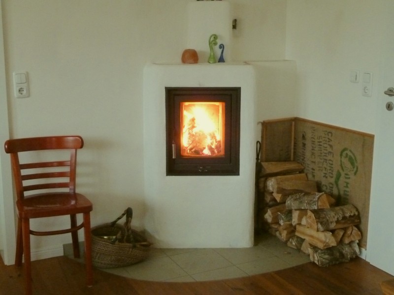 ein kleiner Kachelofen ist im Wohnzimmer zuschaltbar